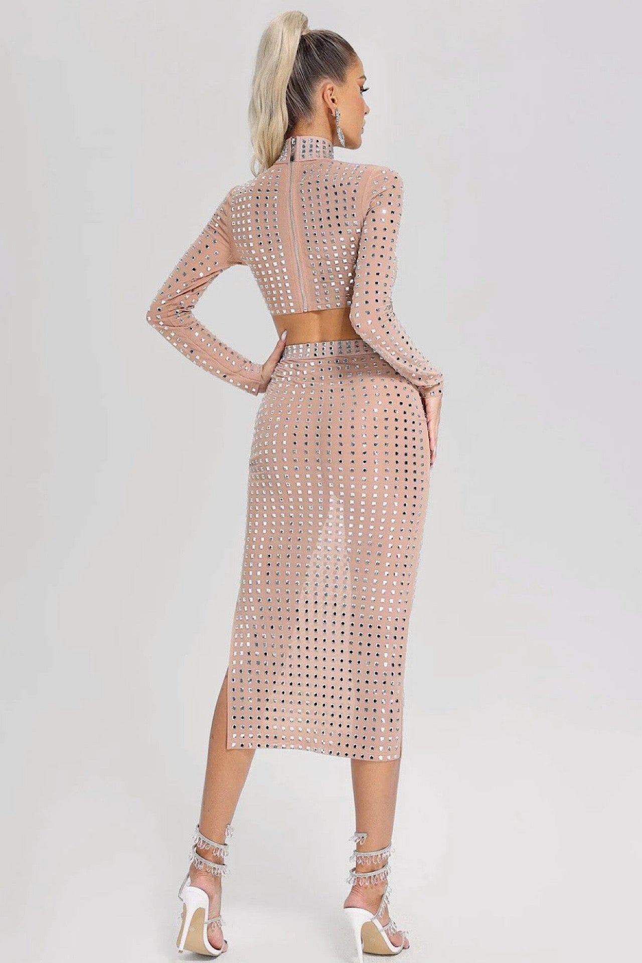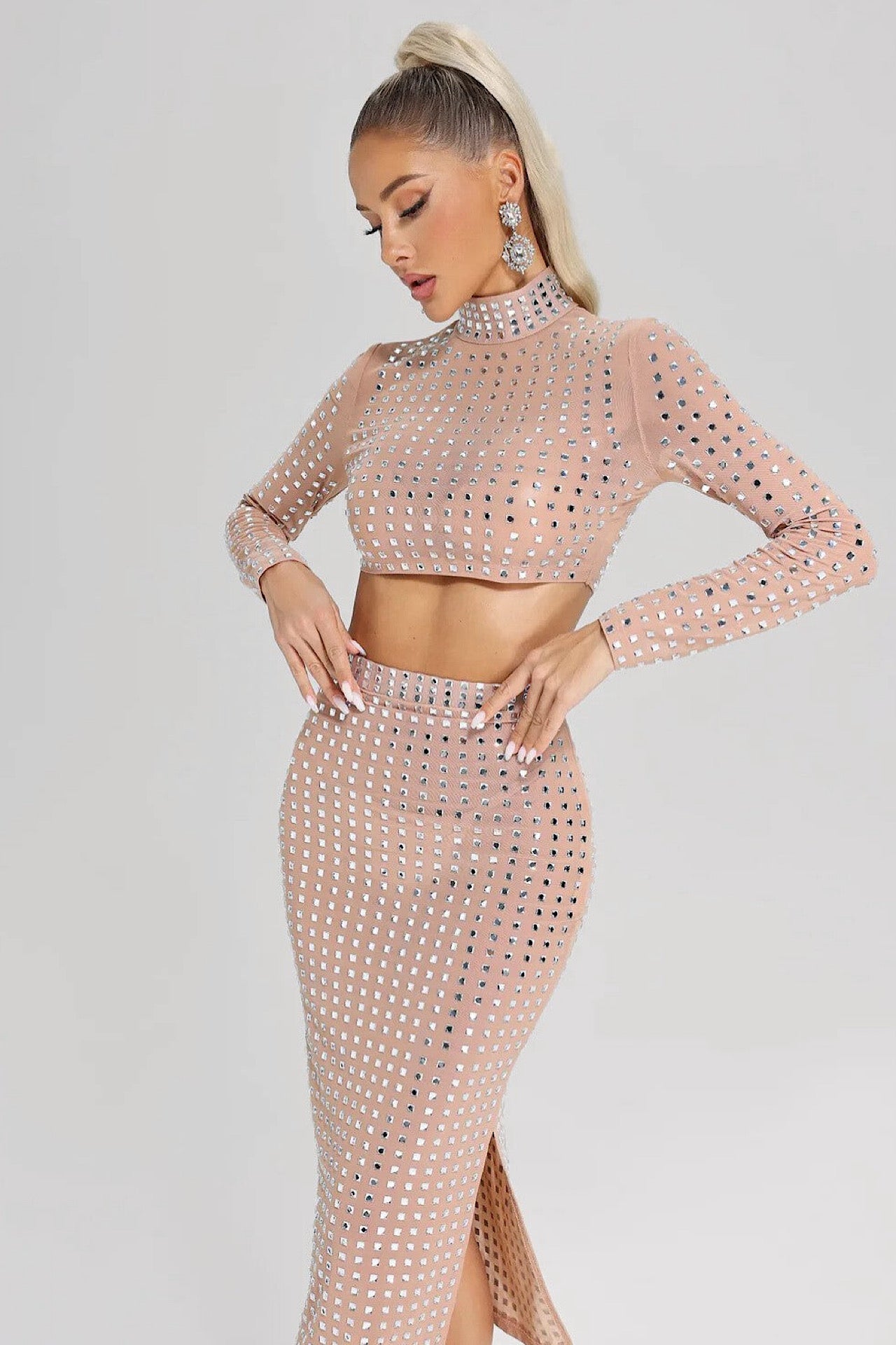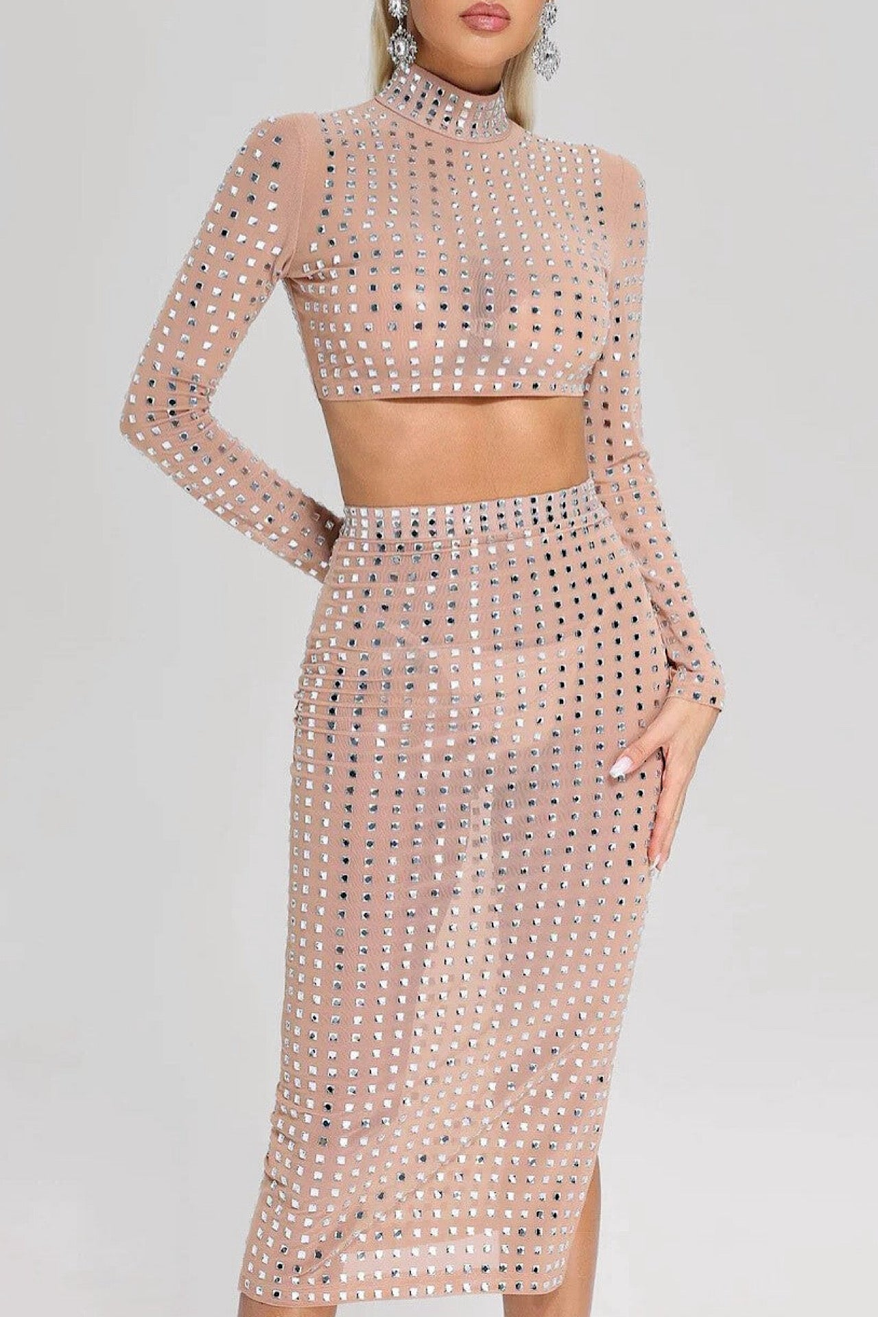 Det er lavet i gennemsigtigt net, som er udsmykket med mange smukke diamanter. Sættet indeholder en masse stræk og tilpasser sig smukt efter kroppen.