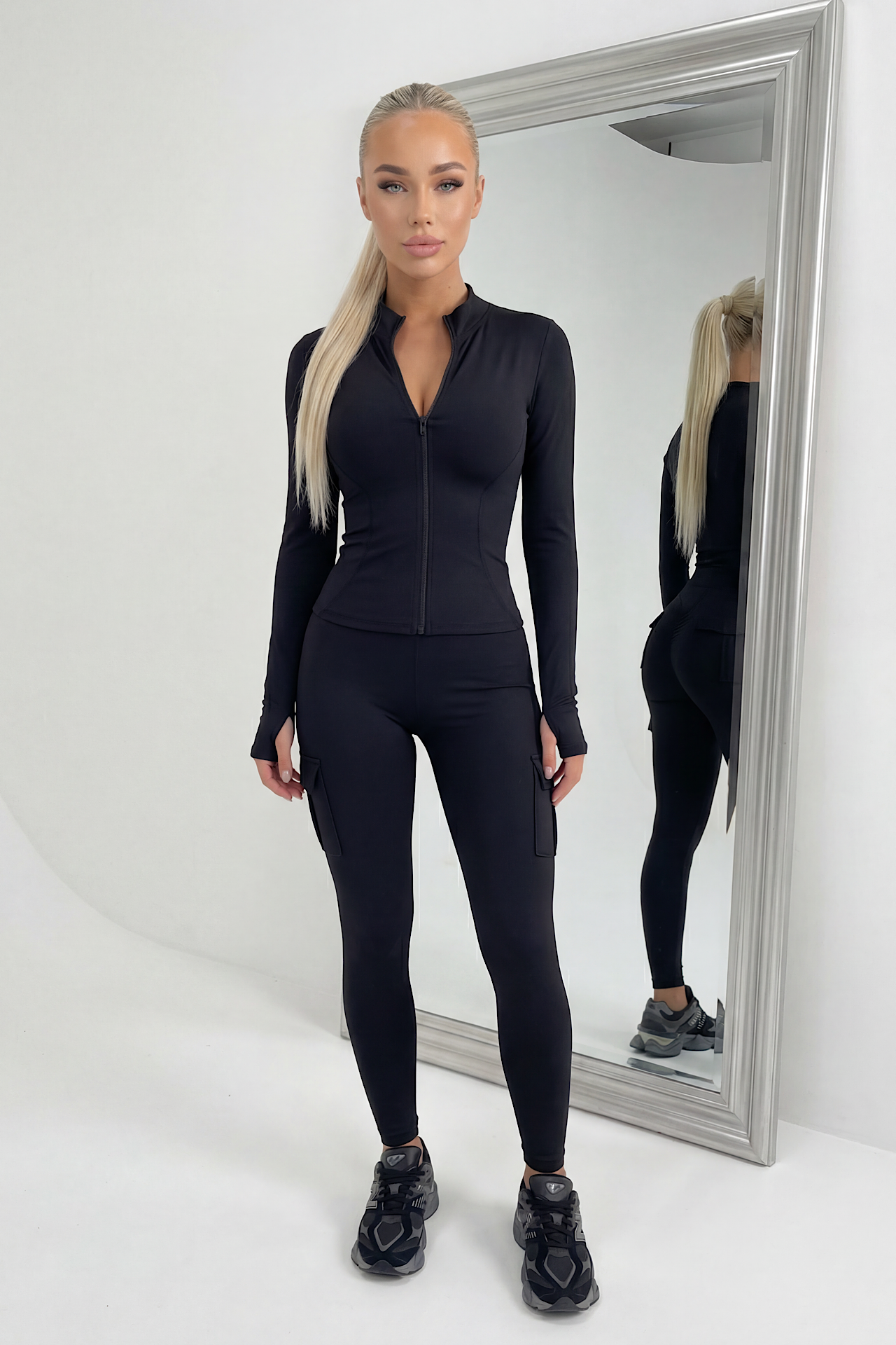 Sættet består af leggings med lommer og trøje med lynlås. Sættet sælges kun samlet.