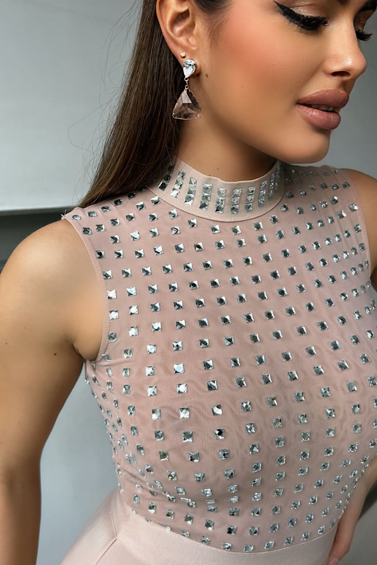 Overdelen er lavet i gennemsigtigt net, som er udsmykket med mange smukke diamanter. kjolen indeholder en masse stræk og tilpasser sig smukt efter kroppen.