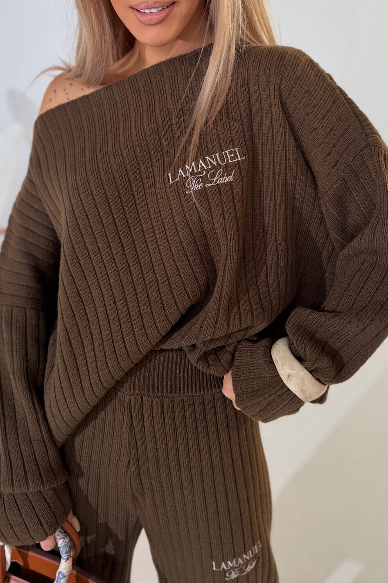 Stoffet har et tydeligt, lodret ribbet mønster – blødt, strækbart og nemt at bevæge sig i. Toppen har sænkede skuldre, vide ærmer og en let oversized pasform. Den kan bæres klassisk eller off-shoulder. Bukserne er højtaljede og har lige ben. Linningen er bred og elastisk – ingen synlige snørebånd eller lukninger. Et minimalistisk logo broderet på bryst og hofte skaber en flatterende silhuet uden at være for stramt. Strikkens blødhed plus den ribbede struktur skaber et look, der ikke ligner loungewear, men føles som loungewear.